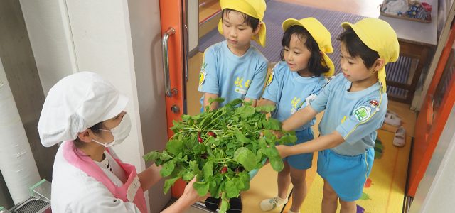 お昼が近づくと給食室から美味しそうな匂いが。温かいご飯やお味噌汁、管理栄養士さんが考える季節の献立は栄養満点です。お肉やお野菜のいのちをいただくお給食。感謝の心を忘れずに、心も身体も大きく育ちます。